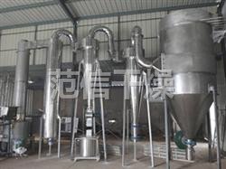 热空气切线进入干燥器底部,在搅拌器带动下形成强有力的旋转风场。膏状物料由螺旋加料器进入干燥器内,在高速旋转搅拌桨的强烈作用下,物料受撞击、磨擦及剪切力的作用下得到分散,块状物料迅速粉碎,与热空气充分接触、受热、干燥。脱水后的干物料随热气流上升,分级环将大颗粒截留,小颗粒从环中心排出干燥器外,由旋风分离器和除尘器回收,未干透或大块物料受离心力作用甩向器壁,重新落到底部被粉碎干燥。